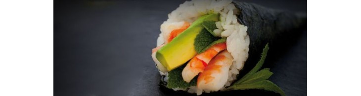 riz vinaigré et ingrédients entourés d' une feuille d' algue nori en cornet